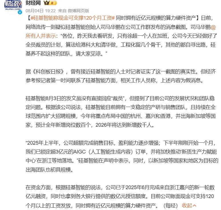 今年 8 月,硅基智能因为一张内部群聊截图被传出 " 裁员 " 的消息,不过公司很快便辟谣;硅基智能表示,公司拥有一支稳定的产研与销售团队,且持续在全球范围内扩大招聘规模。2025 年,将重点布局杭州、嘉兴、香港、新加坡等地,预计全年新增岗位数百个,2026 年将达到新增数千人的扩张节奏。