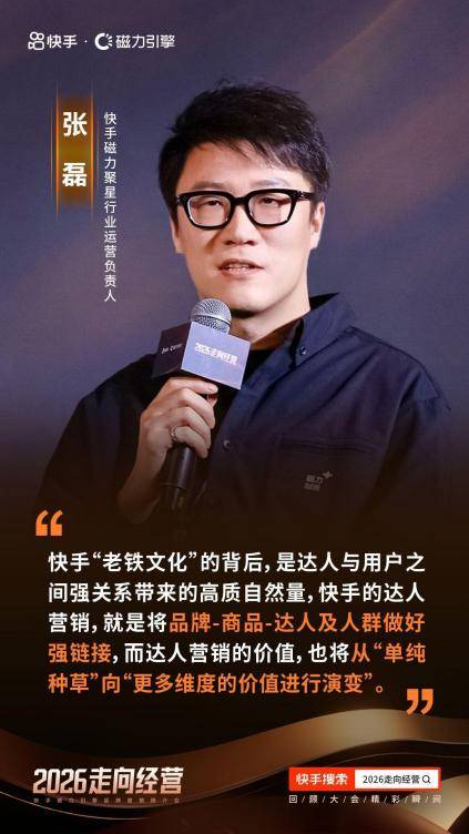 快手磁力引擎营销业务兼磁力聚星业务负责人张梦北在会上表示,2026年,快手品牌营销业务将重点聚焦“AI技术走向落地、品聚营销交付生意、内容营销走向经营”三大方向,针对营销策略、资源、流程进行全面升级,携手品牌在2026年走向经营。