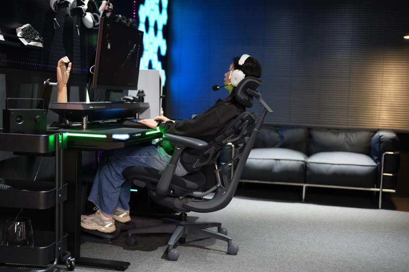 电竞体验区中,主要呈现其座椅在动态场景中的响应性能。清闲智能自主研发了一套全息随动系统,通过四套精密连杆机构实现颈枕、椅背与扶手的毫秒级协同运动。