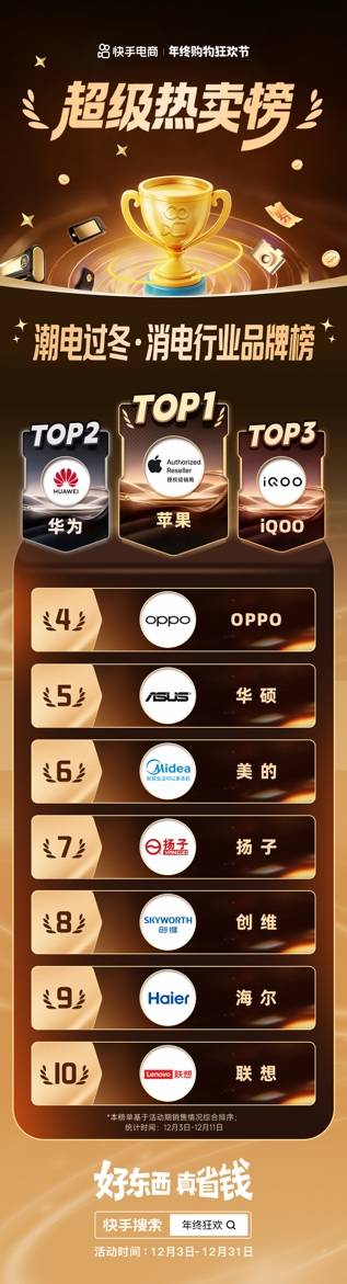 12月3日-12月11日,苹果、华为、IQOO、OPPO、华硕、美的、扬子、创维、海尔、联想成为快手消电行业TOP10热卖品牌。