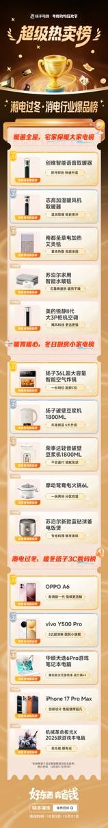 其中大家电类目,创维智能语音取暖器、志高加湿暖风机取暖器、南都圣草电加热艾灸毯、苏泊尔家用智能水暖毯、美的锐静II代大3P柜机空调是TOP5热卖爆品;小家电类目,扬子36L超大容量智能空气炸锅、扬子破壁豆浆机1800ML、荣事达轻音破壁豆浆机1800ML、摩动鸳鸯电火锅6L、苏泊尔新款蓝钻球釜电饭煲是TOP5热卖爆品。