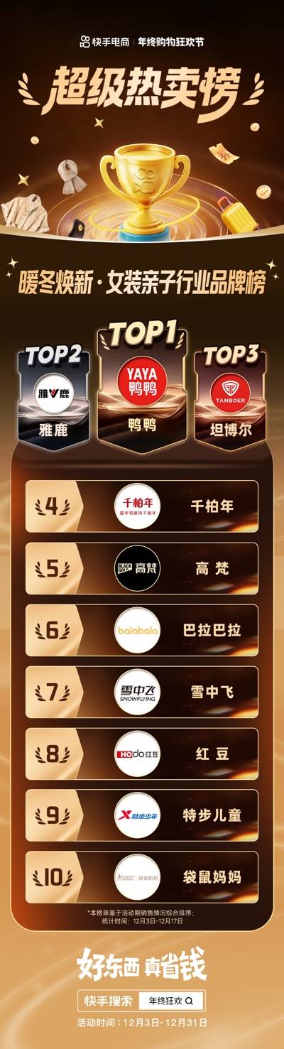 12月3日-12月17日,鸭鸭、雅鹿、坦博尔、千柏年、高梵、巴拉巴拉、雪中飞、红豆、特步儿童、袋鼠妈妈成为快手女装亲子行业TOP 10热销品牌。