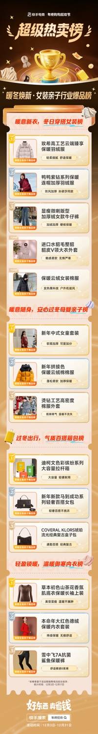 快手电商发布女装亲子及消电行业超级热卖榜,羽绒服、取暖器成年终销售爆品