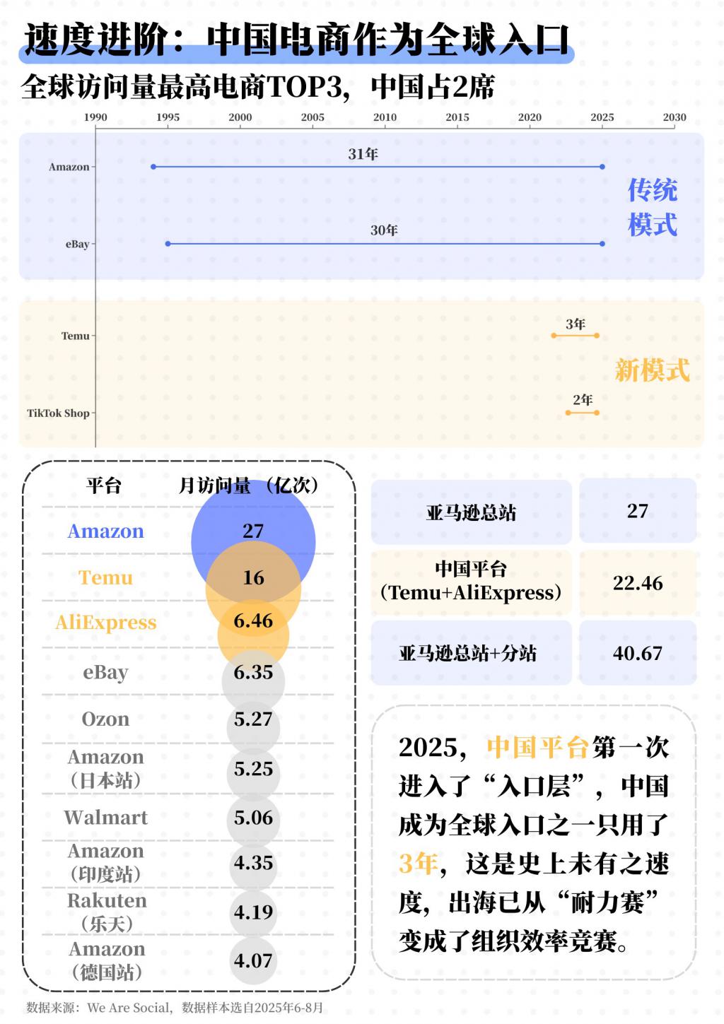 亚马逊用三十多年完成全球化布局,而 Temu、AliExpress 等中国平台,用 2 – 3 年进入全球访问量前列。差异不只在补贴,而在于供应链密度、组织效率和履约体系的整体压缩能力。