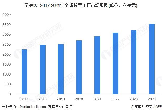 在 2017 年至 2024 年的七年间,全球智慧工厂市场始终保持稳健的逐年增长态势,未出现增长停滞或下滑情况 ; 其中,作为该周期的关键节点,2024 年全球智慧工厂市场规模已攀升至 3546 亿美元,较 2023 年实现 10% 的同比增长率,这一增速既体现了市场对工业数字化、智能化转型的持续需求,也反映出智慧工厂技术在全球范围内的落地应用正不断加速。