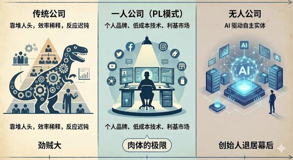 中间,是一人公司(PL 模式)。这是传统模式的巅峰增强版。利用个人品牌、低成本技术和利基市场,将个人能力放大到极致。但同时,它也面临社会规则的切割和肉体的极限。