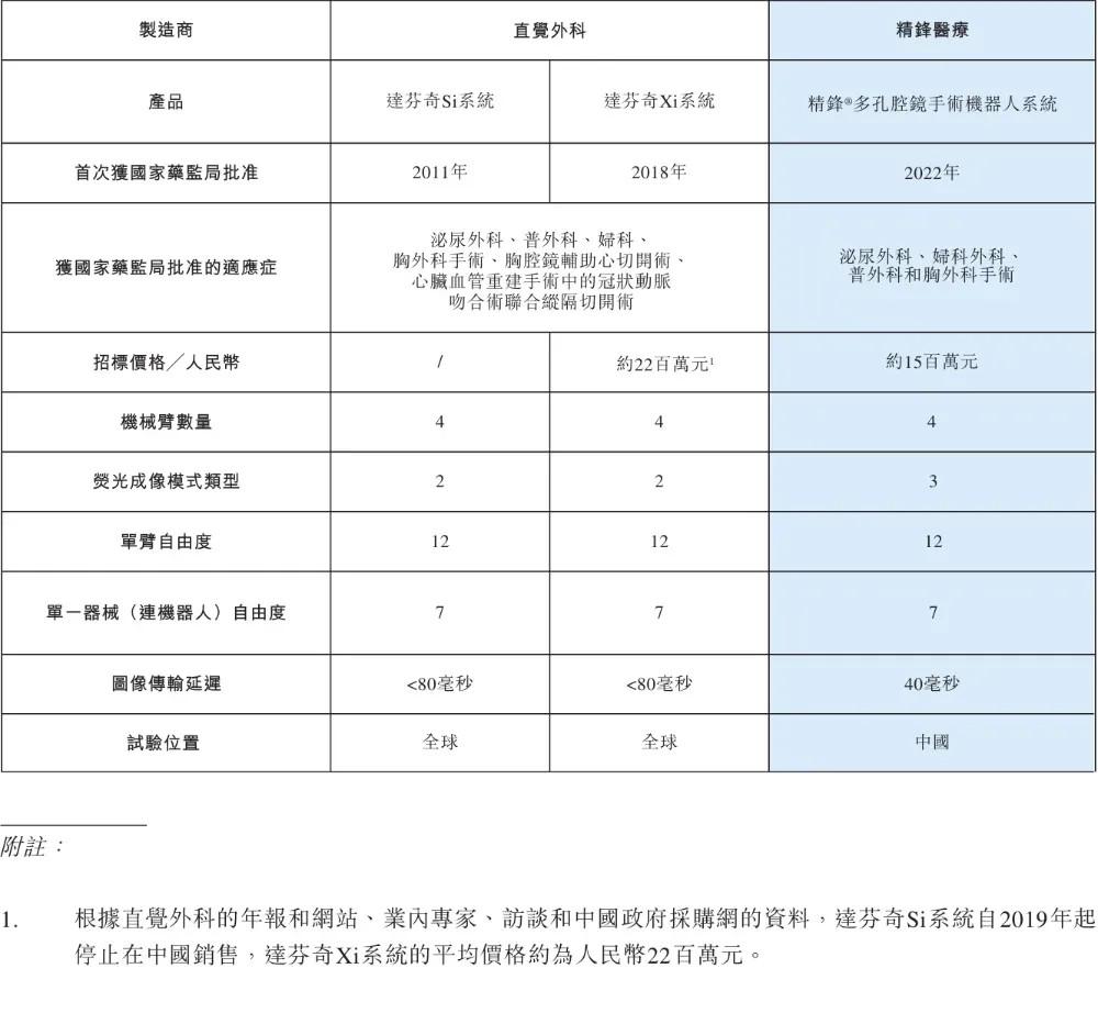 精锋医疗与直觉外科产品对比 图源:招股书