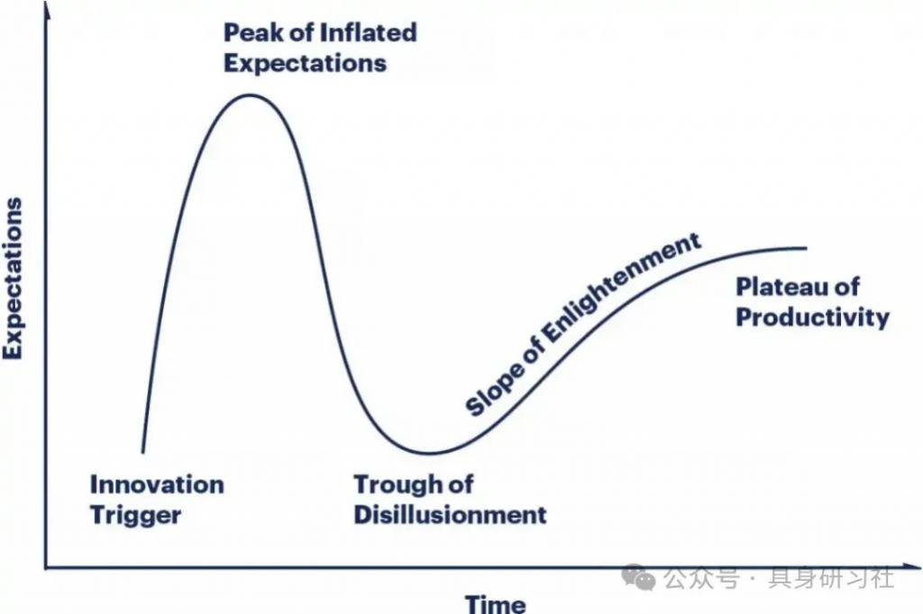 全球领先的技术研究与咨询公司 Gartner 提出了一个新兴技术成熟度曲线,在机器人赛道也值得参考借鉴。这条曲线包含五个阶段:技术萌芽期,概念引发关注;期望膨胀期,媒体炒作推高预期;泡沫幻灭期,实际效果低于预期;复苏期,务实应用逐渐成熟;生产力稳定期,技术价值被广泛认可。