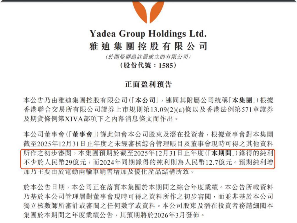 1 月 6 日,雅迪控股(01585.HK,以下简称雅迪)发布正面盈利预告,公告称雅迪 2025 年净利润不少于 29 亿元,相比 2024 年的 12.7 亿元增幅超过 128%,高于市场预期。发盈喜后雅迪高开逾 3%,最终以 11.74 港元收盘,涨幅 4.63%。
