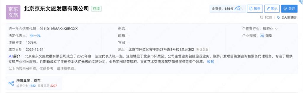据悉,北京京东文旅发展有限公司悄然成立,经营范围横跨旅游业务、歌舞娱乐、航空商务、文化艺术交流等多个领域,由京东世纪贸易全资持股。