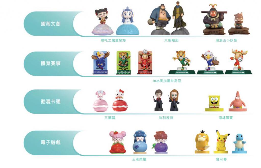桑尼森迪的策略是,与知名 IP 合作。截至 2025 年 9 月 30 日,桑尼森迪与超过 20 个 IP 达成授权合作,共交付 217 个 IP 玩具产品 SKU。包括国潮文创、体育赛事、动漫、电子游戏等 IP 类别。