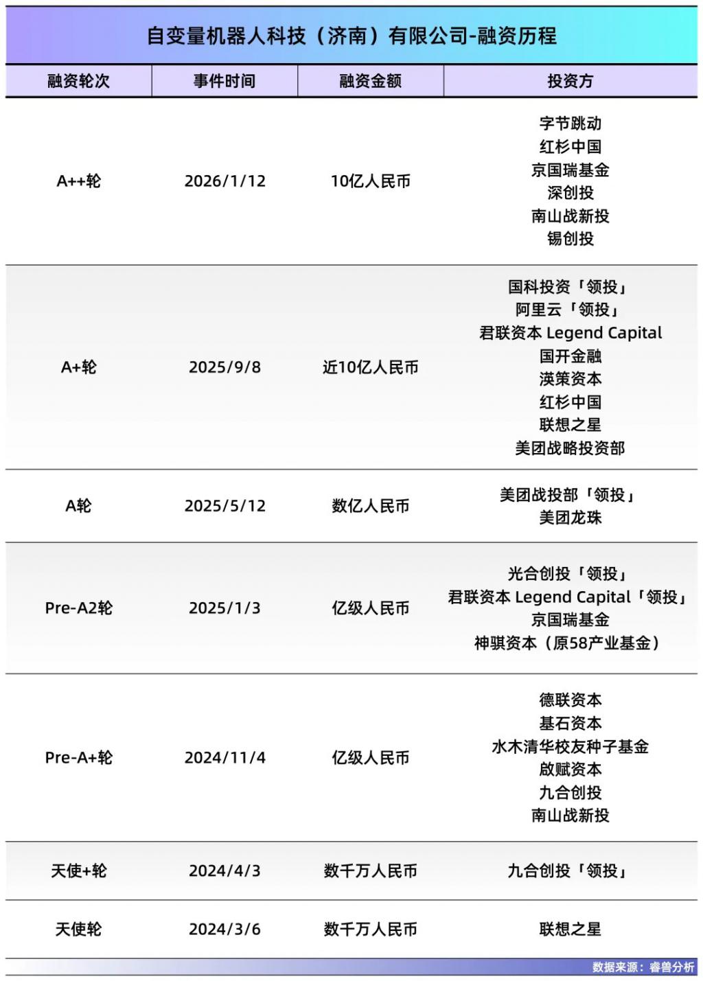 1 月 12 日,自变量机器人完成 A++ 轮融资,金额为 10 亿元人民币。字节跳动、红杉中国、深创投等顶级机构领投。