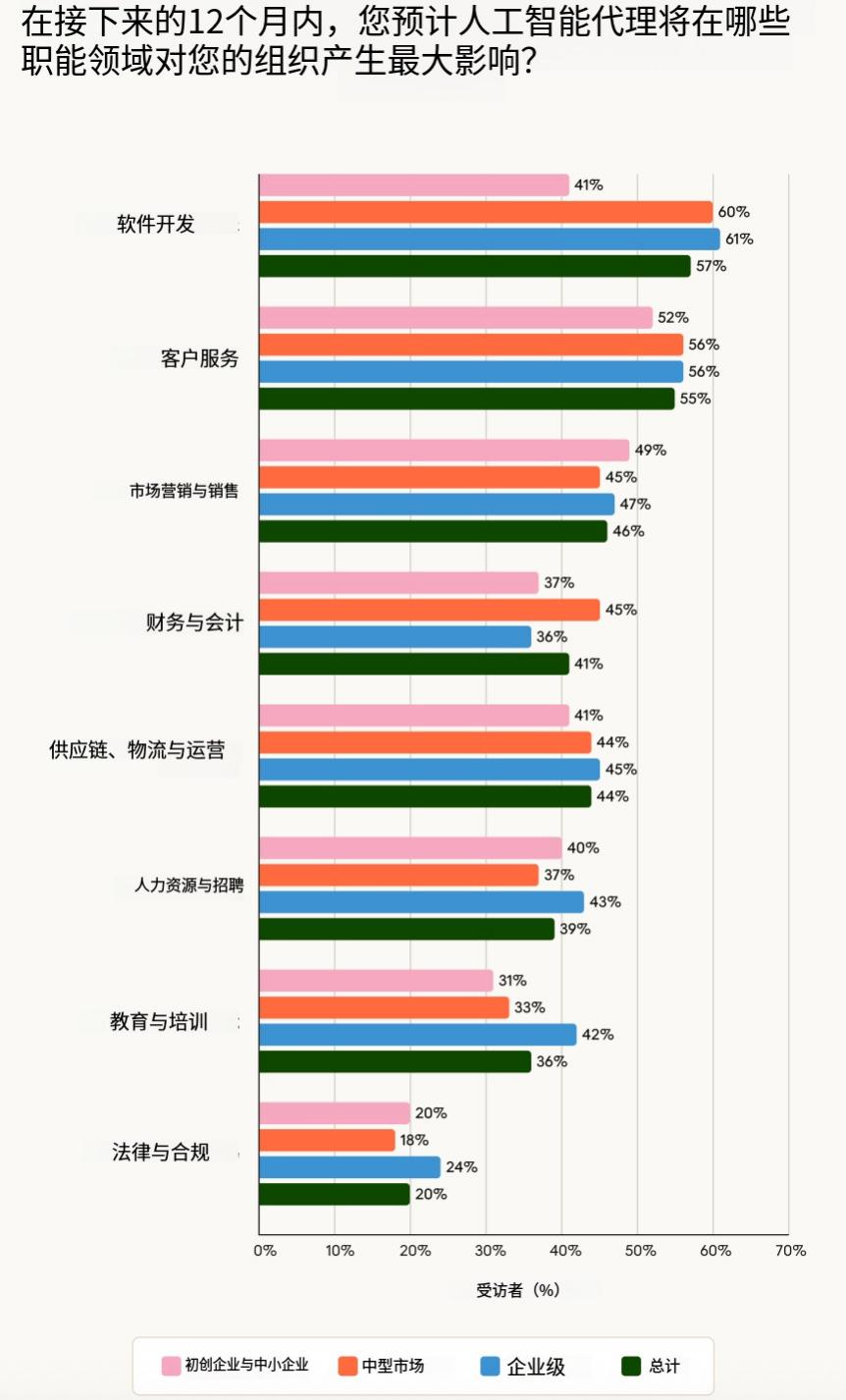 未来 12 个月,各组织期望人工智能智能体的应用能远远超出工程和信息技术职能。56% 的组织计划优先采用人工智能智能体进行研究和报告工作,尤其是在中型市场和企业组织中,紧随其后的是供应链优化、产品开发和财务规划。计划应用场景的广度表明,人们正从将人工智能智能体视为特定部门的工具,转向将其视为企业级基础设施。