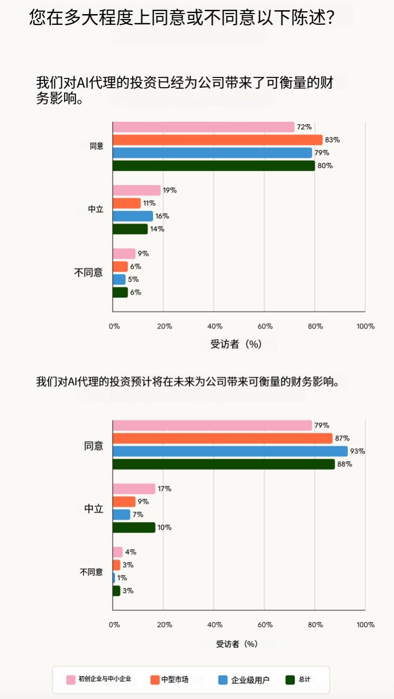 大多数组织(80%)报告称,他们在人工智能智能体方面的投资目前已经产生了可衡量的经济影响,而且对未来的信心更高 —— 88% 的组织预计回报将持续或增长。这并非推测性的投资回报率;大多数组织从其部署中看到了实实在在的商业价值。