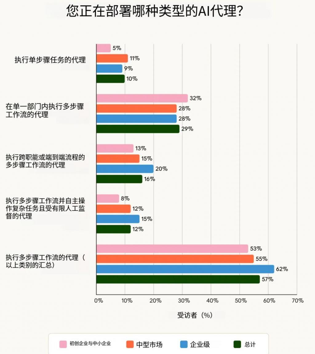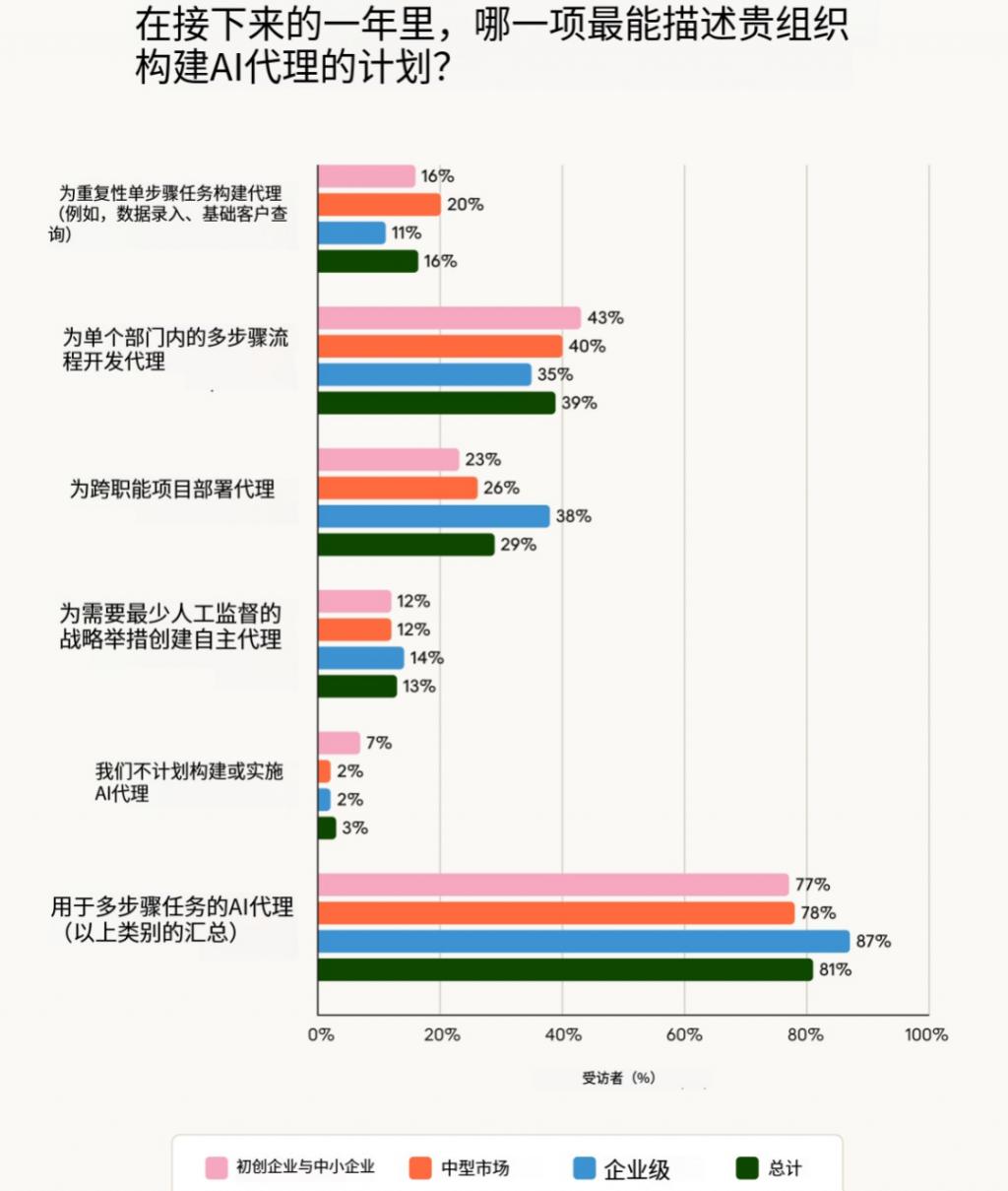 大多数组织(81%)计划在 2026 年从简单的任务自动化转向更复杂的人工智能项目,其中企业在这一转变中处于领先地位,占比 87%,而中小企业为 78%。至于 " 更复杂 " 具体意味着什么:39% 的组织期望开发能够处理多步骤流程的智能体,29% 的组织计划部署智能体用于跨多个团队或部门的跨职能项目。