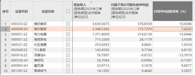 2025 年前三季度,海尔智家实现营业收入 2340.5 亿元,同比增长 10%;归母净利润 173.7 亿元,同比增长 14.7%。