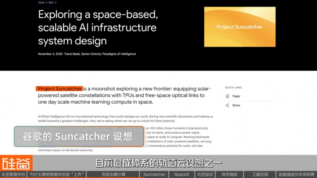 目前最成体系的轨道云设想之一,来自谷歌内部的Suncatcher Projec("捕光者"计划),它的核心思路是:在轨道上部署相对固定位置的算力平台,通过持续稳定的太阳能供电,为地面的数据中心提供算力补充。