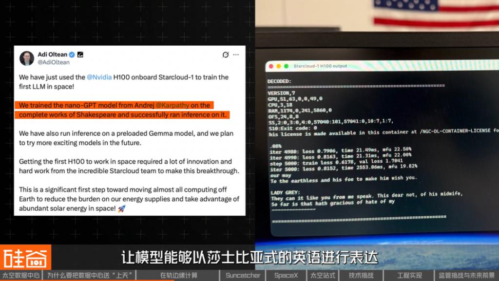 截至目前,它在太空中完成了几个重要任务:一是成功调用了谷歌的开源模型Gemma,并向地球发出了"Hi地球人,你们好"的问候,仿佛一个地外智慧生命;二是使用莎士比亚全集训练由OpenAI创始成员Andrej Karpathy打造的NanoGPT,让模型能够以莎士比亚式的英语进行表达;三是实时读取传感器数据,进行实时情报分析,比如瞬间识别野火热信号等,并及时通知地面人员。