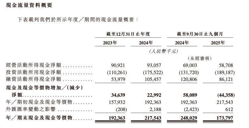 2025 年前三季度,锦欣康养的投资净流出为 1.89 亿元,已是同期经营现金流 0.59 亿元的 3.2 倍,亦高于融资活动所得的 0.86 亿元,直接使得同期的现金及现金等价物减少净额达 0.44 亿元。