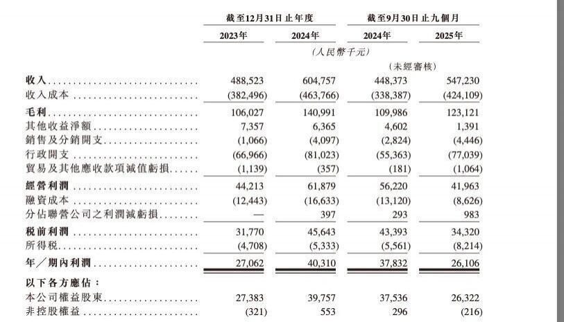 报告期内,公司收入由 2023 年的 4.885 亿元增加 23.8% 至 2024 年的 6.048 亿元,并由截至 2024 年 9 月 30 日止九个月的 4.484 亿元增加 22.0% 至截至 2025 年 9 月 30 日止九个月的 5.472 亿元。
