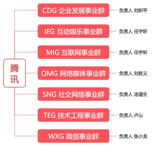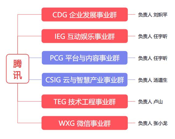 MIG(互联网事业群)、OMG(网络媒体事业群)、SNG(社交网络事业群)全部打散,to C 部分被收编进新设的 PCG(平台与内容事业群)、to B 部分收入 CSIG(云与智慧产业事业群)中。