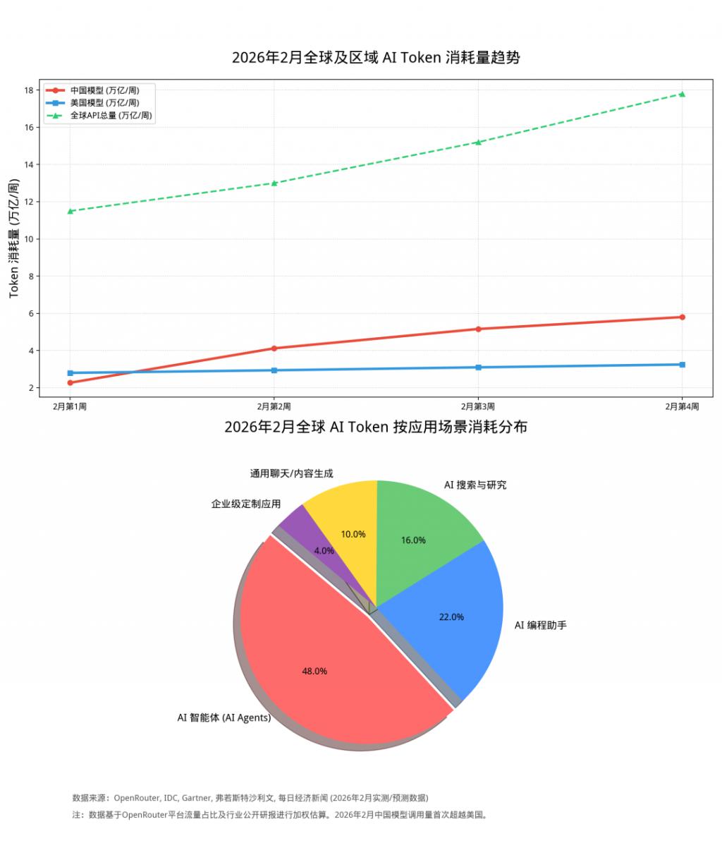 也因此,中国的 Token 出海正成为一项新产业——在全球最大的 AI API 聚合平台 OpenRouter 上,刚过去的 2 月,MiniMax 的 M2.5、月之暗面的 Kimi K2.5、DeepSeek 的 V3.2 三款国产模型的 Token 消耗量跻身全球前五;平台前十模型的总 Token 消耗约 38.2 万亿,其中中国模型独占 17.3 万亿,占比 45%。