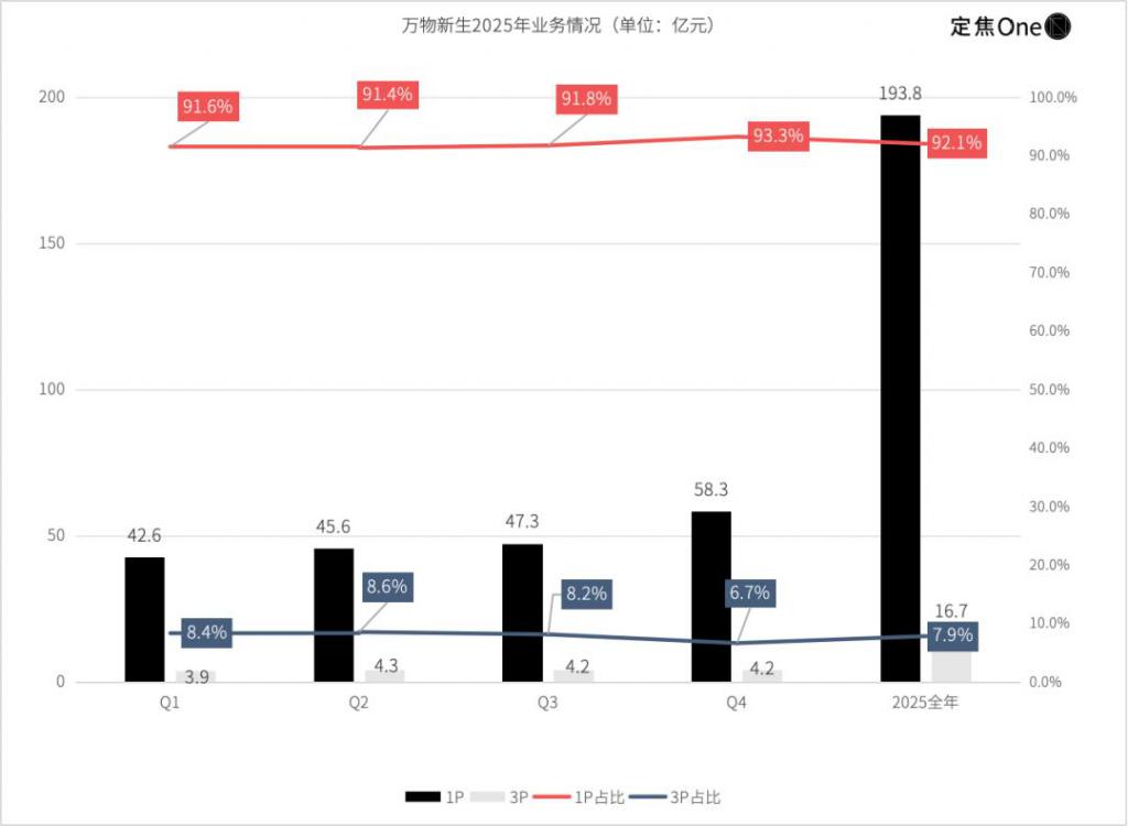 2025 年全年,万物新生总营收达210.5 亿元,其中 1P 自营业务收入 193.8 亿元,占比高达 92.1%,且四个季度营收占比均超九成;3P 服务业务收入 16.7 亿元,同比增长 12.4%,虽为高毛利辅助板块,但规模占比仅 7.9%,尚未形成能与 1P 并行的第二增长曲线。