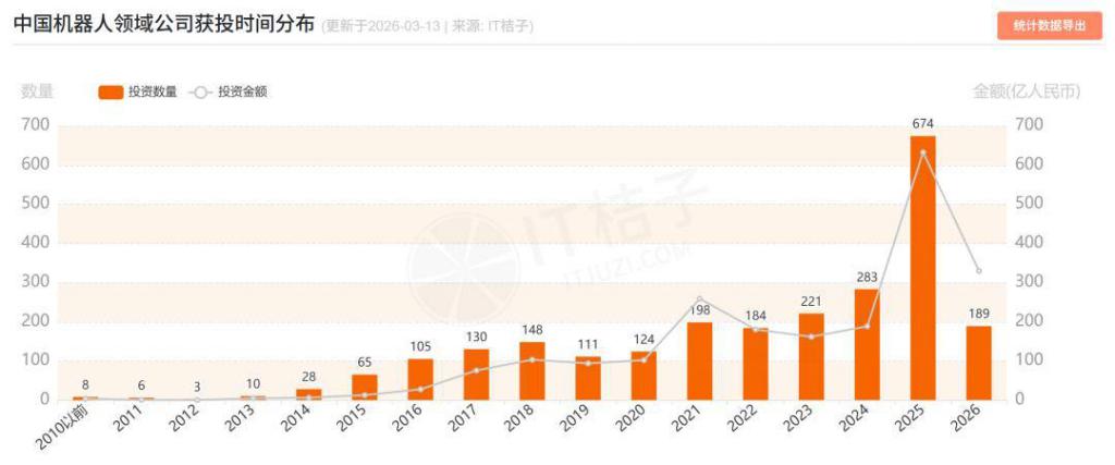 真正的拐点发生在 2025 年。全年投资数量跃升至 674 笔,投资金额亦同步冲至峰值,中国机器人产业的资本热度由此抵达前所未有的高点。