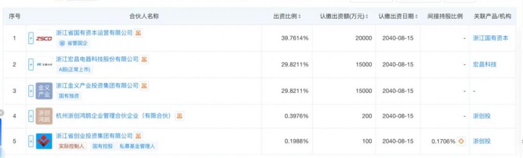 在股权结构上,两只浙创投基金的持股比例分别为金华浙创约 5.50%、杭州浙创约 2.75%。其中,金华浙创的出资人结构中,A 股上市公司宏昌科技(301008)出资占比 29.82%。