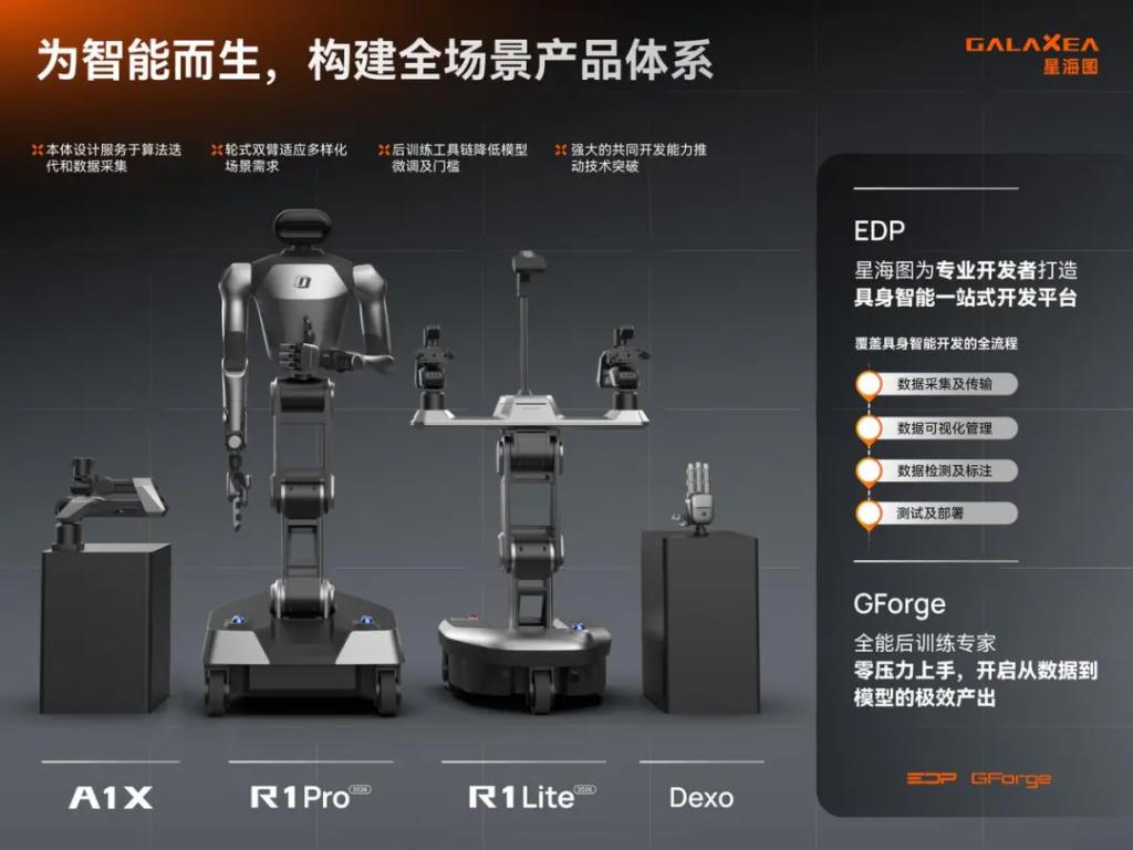 硬件之外,星海图自研的 EDP 具身智能开发平台实现了真实场景下从数据采集、标注到模型部署的全流程闭环。通过集成一站式后训练工具,EDP 与具身基础模型、机器人本体深度协同,大幅降低了研发门槛,为开发者提供了一条从原型验证到规模化部署的高效路径。