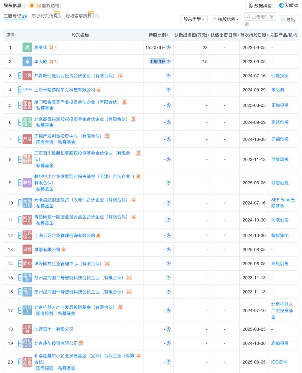 以具身智能数据采集解决方案提供商,简智机器人为例。工商变更显示,今年 2 月,该公司刚刚获德联资本入股,此前,简智机器人已完成第三轮融资,这也是该公司成立 4 个月的第 3 轮融资,总额超 2 亿元。其中,种子轮融资正是由 BV 百度风投领投,星海图、Momenta、九识跟投。