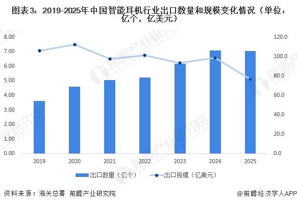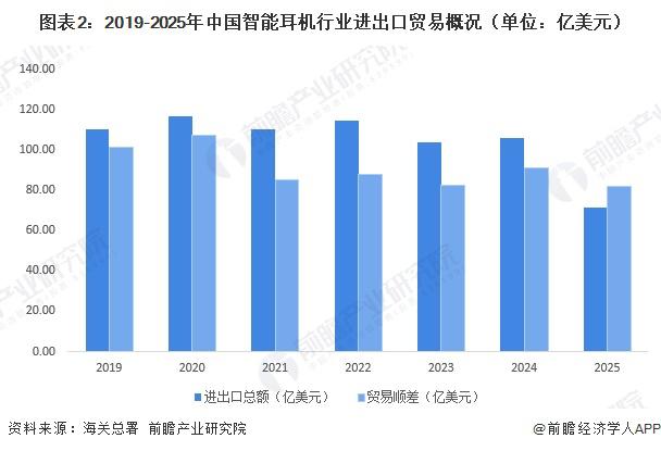 2019-2025 年,我国中国智能耳机行业进出口总额总体有所下滑,2025 年进出口总额为 82.14 亿美元,同比下滑 9.89%;实现贸易顺差 71.35 亿美元,同比下滑 32.45%。