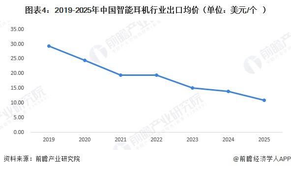从出口价格水平的情况来看,2019-2025 年期间,中国智能耳机产品出口价格呈现下滑趋势。2019 年,中国智能耳机产品出口单价达到统计时间段内的峰值,达 29.31 美元 / 个。2025 年,中国智能耳机产品出口价格为 10.91 美元 / 个。