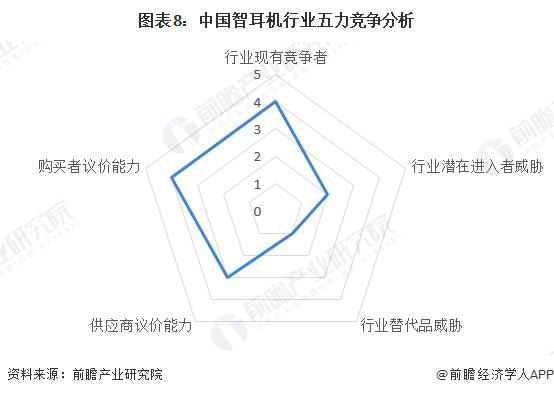 从波特五力分析模型来看,中国智能耳机行业基本形成了以小米、华为、OPPO、漫步者等为代表的国产智能耳机阵营和以苹果三星为代表的两大国外耳机品牌阵营,市场竞争较为激烈;智能耳机行业作为高科技行业,伴随着各种专利之争,对于新进入者很难达到。总的来说,智能耳机行业潜在进入者威胁不大;智能耳机已经成为人们日常生活中最重要的一部分,目前智能耳机的地位依旧无可撼动,因此行业替代品威胁较小;智能耳机行业的上游主要是芯片、声学器件、电池等零部件。其中多数零部件产品供应数量较多,分布广泛,上游整体议价能力一般;目前我国智能耳机行业下游核心为手机消费用户,智能耳机行业对下游议价能力一般。