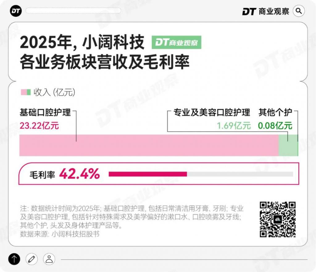 参半的另一重压力来自渠道。当前个护赛道仍以线下为主,智研咨询数据显示,2024 年中国口腔护理市场线上零售额占比 46.9%,线下占比 53.1%。而 2025 年,小阔科技线上销售占比 80.3%,线下仅占 19.7%。