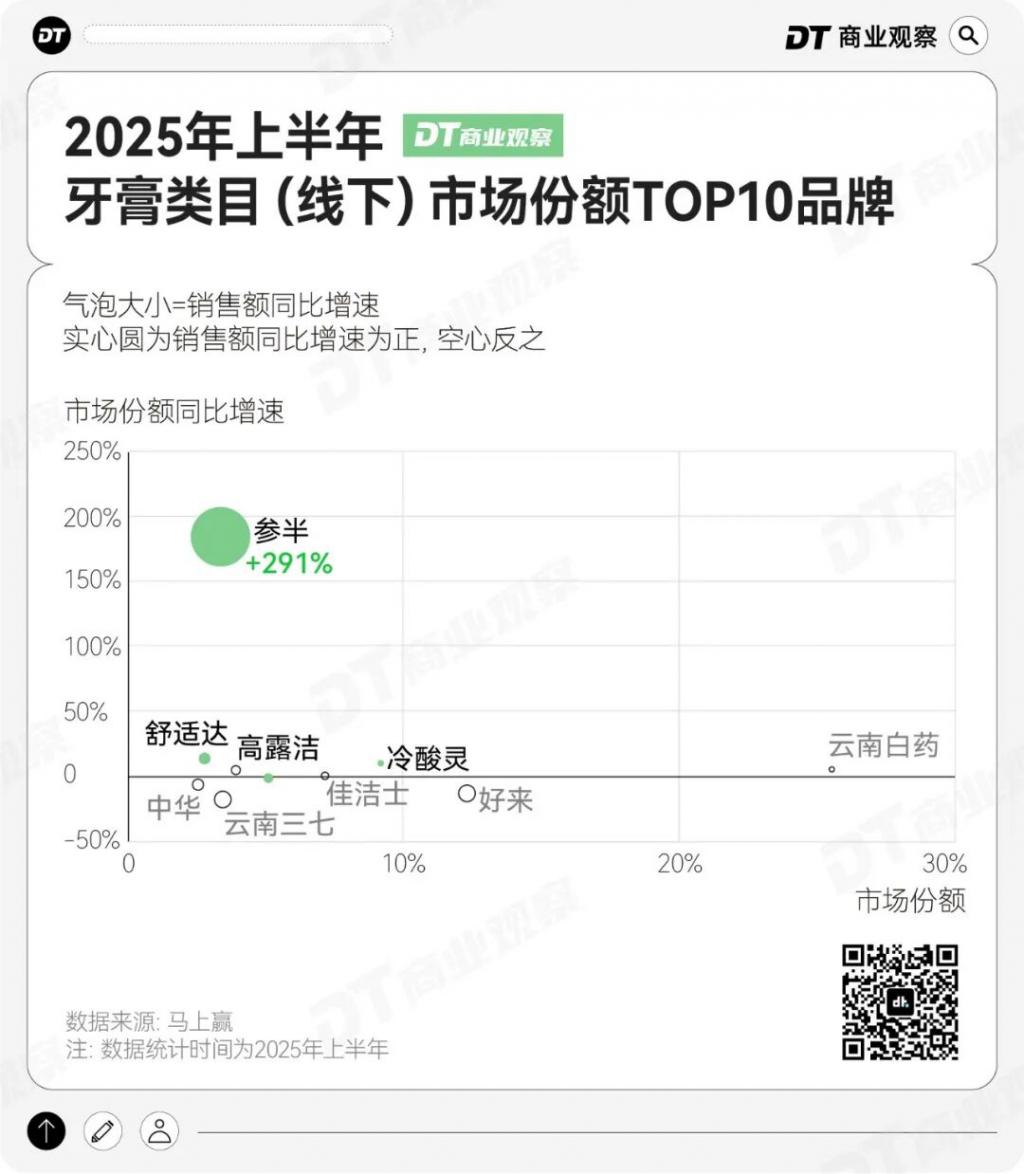 成效确实显著。马上赢数据显示,2025 年上半年,参半线下牙膏市场增速第一,线下市场份额同比增长 184%,销售额同比增长 291%。招股书显示,2023-2025 年,线下收入占比已从 5.5% 提升至 19.7%。