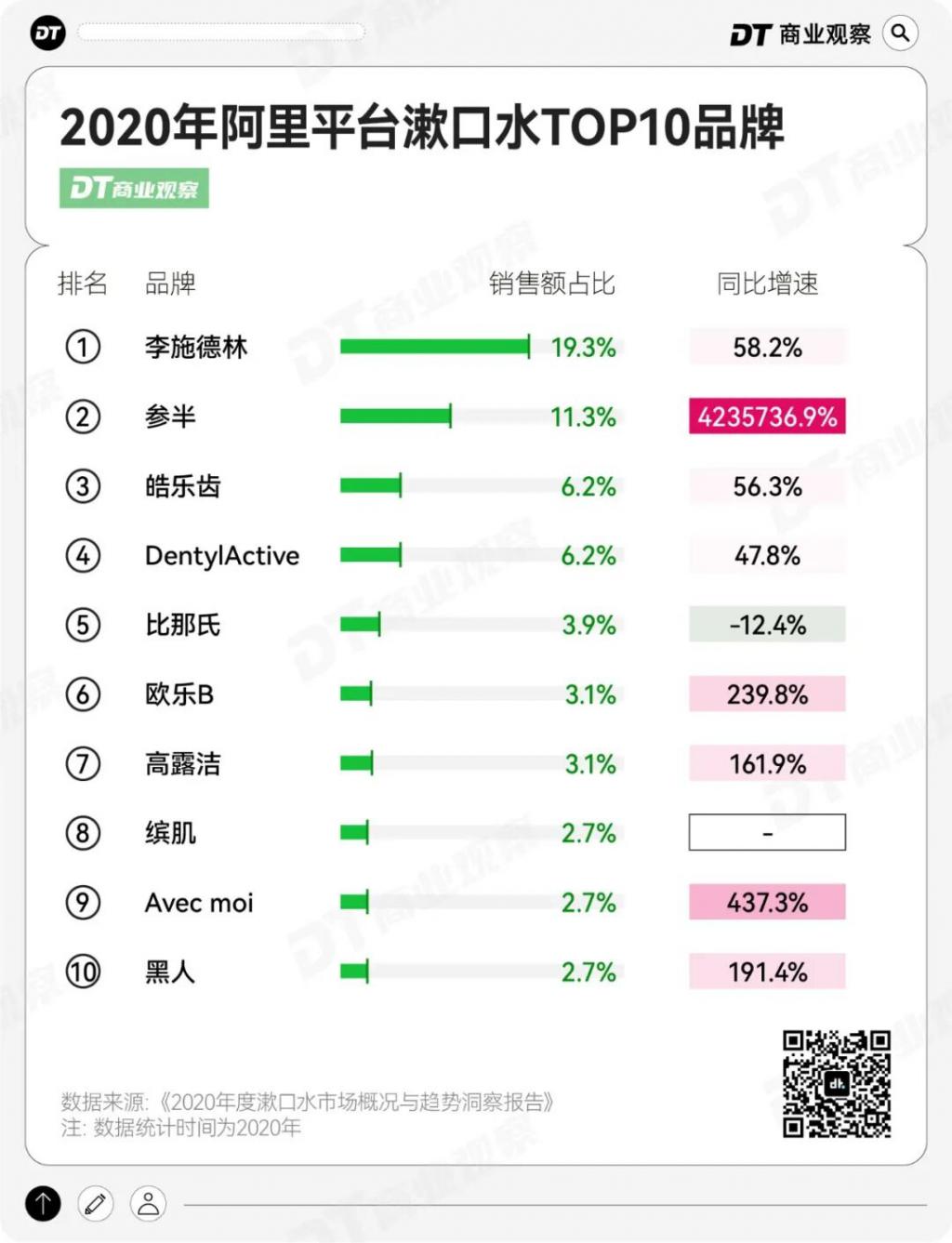 据阿里平台数据,2020 年参半以 4.2 万倍的同比增速,拿下漱口水 11.3% 的市场份额,从 " 无名之辈 " 直接跃居市场 TOP2,仅次于李施德林。