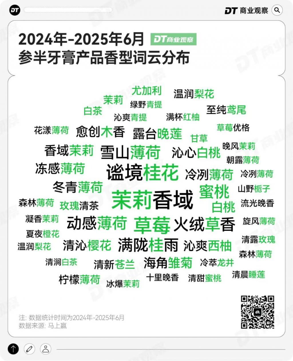 此外,参半还把调香思维引入牙膏。长期以来,牙膏市场都是薄荷的天下,马上赢数据显示,2024Q3-2025Q2,牙膏类目 TOP 200 SKU 中,有 112 个薄荷香型,占比超过一半。