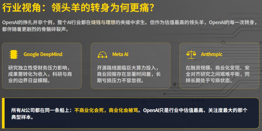 从 DeepMind 到 Anthropic,整个 AI 行业都在烧钱与理想的夹缝中求生。但作为估值最高的领头羊,OpenAI 的每一次转身,都伴随着更剧烈的骨骼碎裂声。