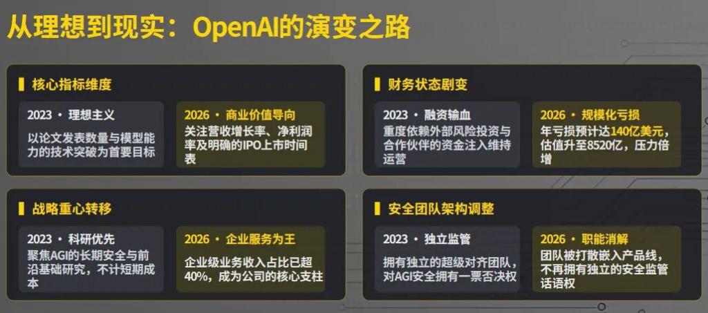 注:这是渐变过程的简化呈现,而非一夜之间的翻转。2023 年 OpenAI 已开始商业化,2026 年也并未完全放弃研究。这种演变背后,是算力约束、资本压力与科研理想的持续博弈。