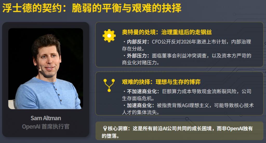 这正是一场典型的浮士德式交易—— OpenAI 以牺牲部分科研自主权为代价,换取了支撑其继续运转的资本,也背上了无法回头的 IPO 枷锁。
