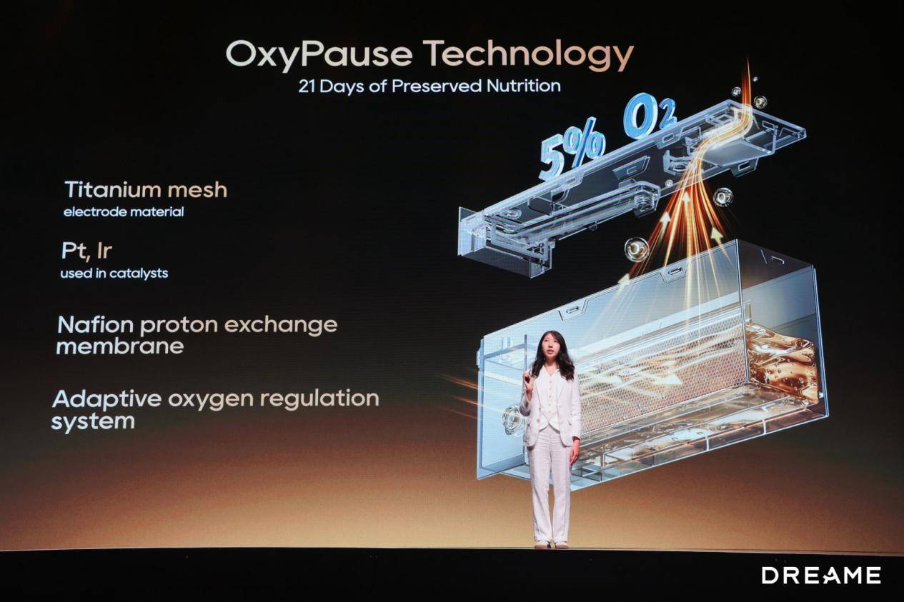 在冰箱的核心保鲜领域,追觅冰箱本次发布第二代 5%超低氧保鲜技术。行业主流控氧保鲜技术,除氧浓度常常高达15%~19%,而追觅通过贵金属电极材料、自适应压力密封技术、AI智控系统,将低氧舱内氧气浓度稳定控制在5%—黄金保鲜区间。权威测评机构实测,果蔬保鲜长达21天持久新鲜,存储15天后花青素提升率231.52%、维生素C保留率137.24%、多酚保留率115.85%,总营养留存率较行业平均提升130%以上。